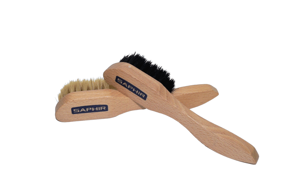 As handsome to look at as it is comfortable to hold, the ergonomic Saphir Spreading Brush has a beautifully grained hardwood handle with a brilliantly designed curve that allows it to nestle easily into the hand as it is used. The natural boar bristles will not mar smooth leathers which makes it just the tool to use to spread polishes, waxes and protectants. Keep your fingers clean and product applied evenly, improving the result of your leather treatments. The Saphir line of products are well regarded for their ability to care appropriately for a wide range of footwear, bags and other leather and textile items. Find these French made formulations and tools online at Valentino Garemi, your Canadian leather care connection.
