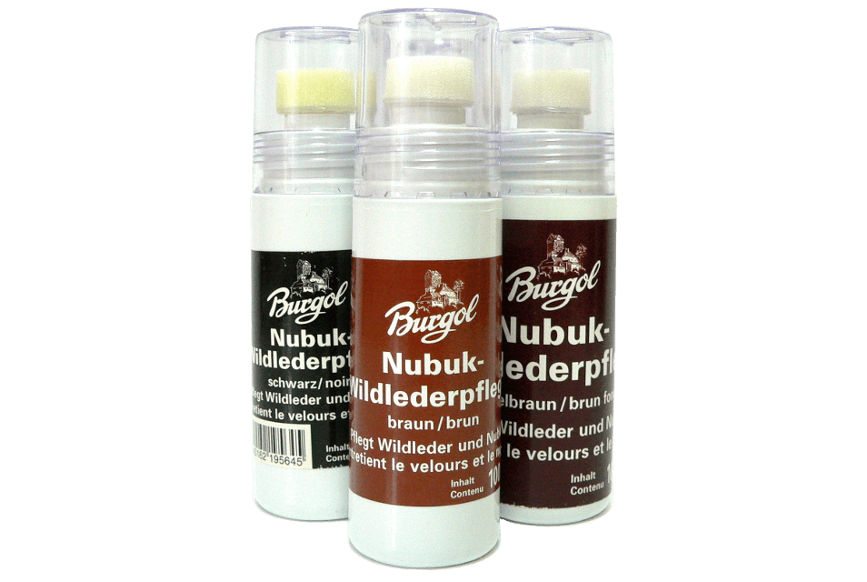 Clean, protect and rejuvenate your precious suede or nubuck leather footwear and bags with Burgol Shoe Cleann & Protector (Burgol Nubuk-Wildlederpflege). Because of the needs of their special textures suede and nubuck can benefit from this effective cleaner and conditioner. Regular use will protect from soiling and moisture, this ecologically appropriate product comes in a sponge tip bottle, avoiding the need for a spray formula.  Available in a variety of colors; choose yours from the drop down menu. Burgol not only manufacturers some of the highest quality leather care products available in the world, it also takes care that the ingredients used are natural and gentle on both leather and the environment and that the packaging is chosen intelligently and sustainably. We are proud to partner with Burgol at Valentino Garemi.