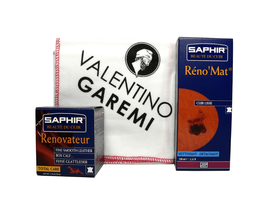 For your leather footwear and other goods to look and feel their very best make the Saphir Rejuvenating Leather Care Set part of your leather maintenance plan. Remove dirt, grease and layers of waxes and polish with Saphir Reno’Mat Cleaner, bringing your leather goods back to their original finish, ready to absorb the nourishment of Saphir Renovateur. Saphir Reno’Mat can be used every three to six months for thorough cleaning while Saphir Renovateur acts as a daily cleaner and conditioner. Use the included Polishing Chamois Cotton Cloth to apply the products, remove soil and residue, and buff leather to a soft shine. When you choose Saphir you reveal you leather care savvy. Meticulously crafted in France and true to award winning formulas, select and purchase from among a wide range of effective and high quality leather and textile care solutions from Saphir online at Valentino Garemi.